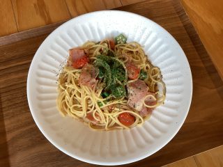 ベーコンの旨み、彩りのオクラ、ゴロゴロ入ったミニトマトの酸味が絶妙な味わいのペペロンチーノに仕上がっております。ぜひご賞味ください😊